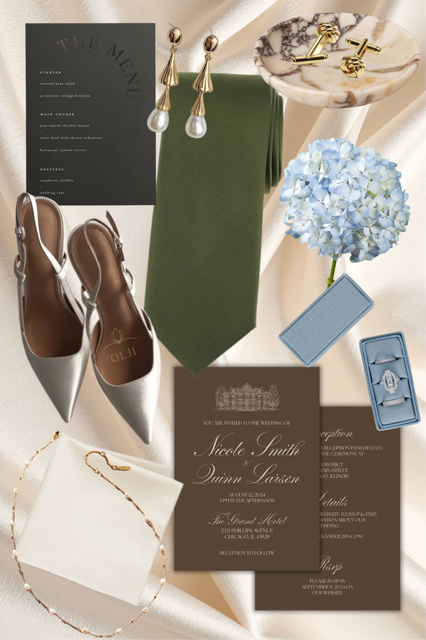 The flatlay collage highlights how the color palette translates into the finer details of your wedding day. From brown wedding invitations and sage accessories to soft blue floral accents and pearl jewelry, every element works together effortlessly.