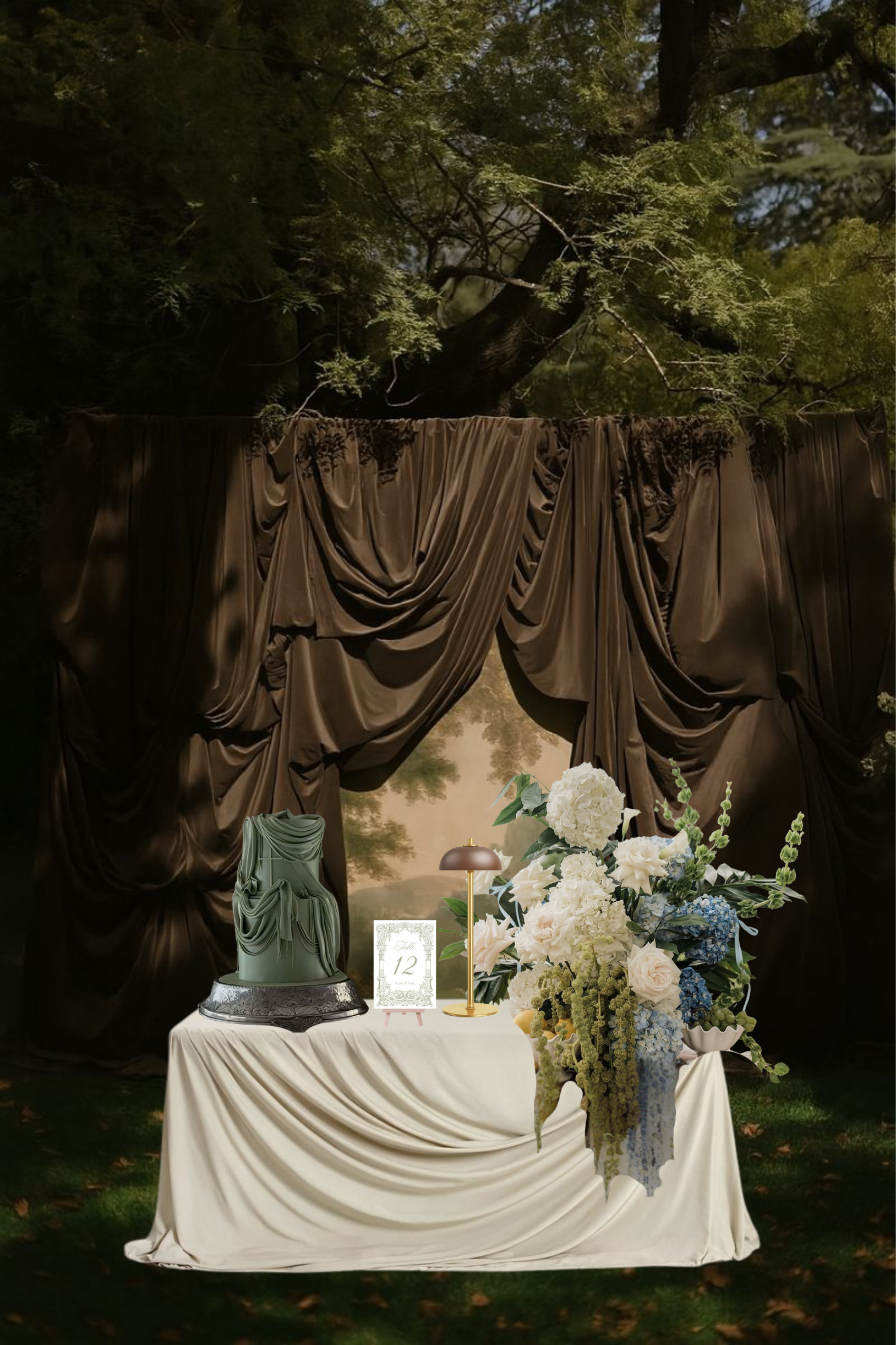 The table décor collage brings the entire palette together in a dramatic yet elegant way. Rich brown draping sets the mood, while ivory linens, sculptural green cake details, and lush blue-and-cream florals soften the look.