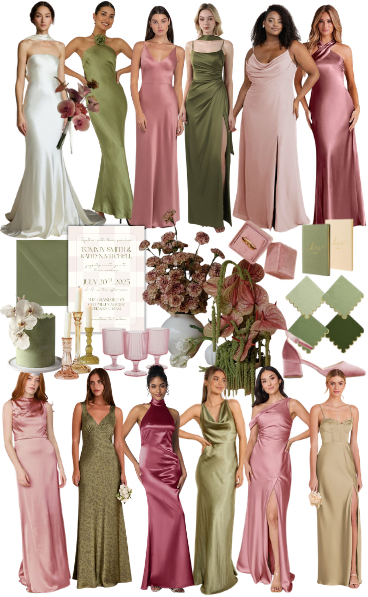Planning a romantic garden wedding? This pink and green wedding color palette is perfect for spring and summer celebrations! Featuring satin bridesmaid dresses, botanical floral arrangements, green and blush wedding decor, and elegant invitation designs, this dreamy aesthetic is ideal for the modern, romantic bride. Save this wedding mood board for your garden wedding ideas!