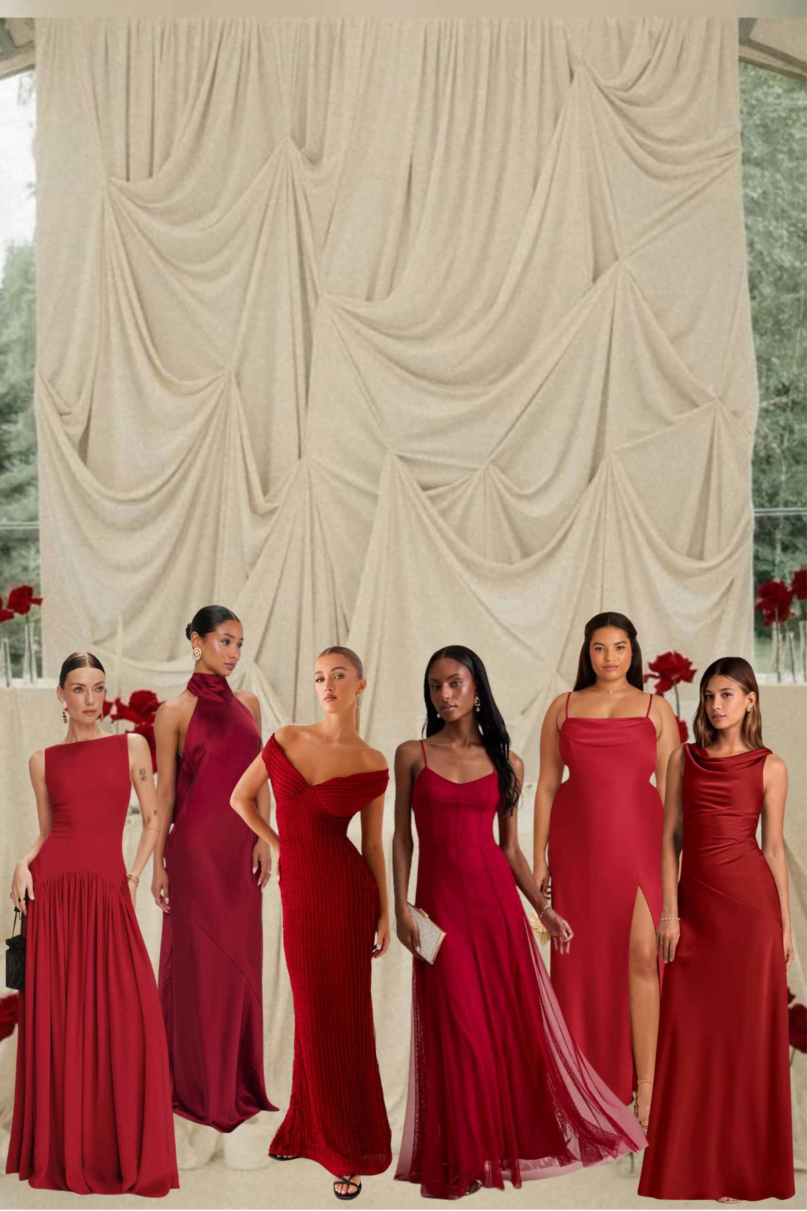 collage features a lineup of bridesmaid dresses in varying shades of red, creating depth while maintaining cohesion.
