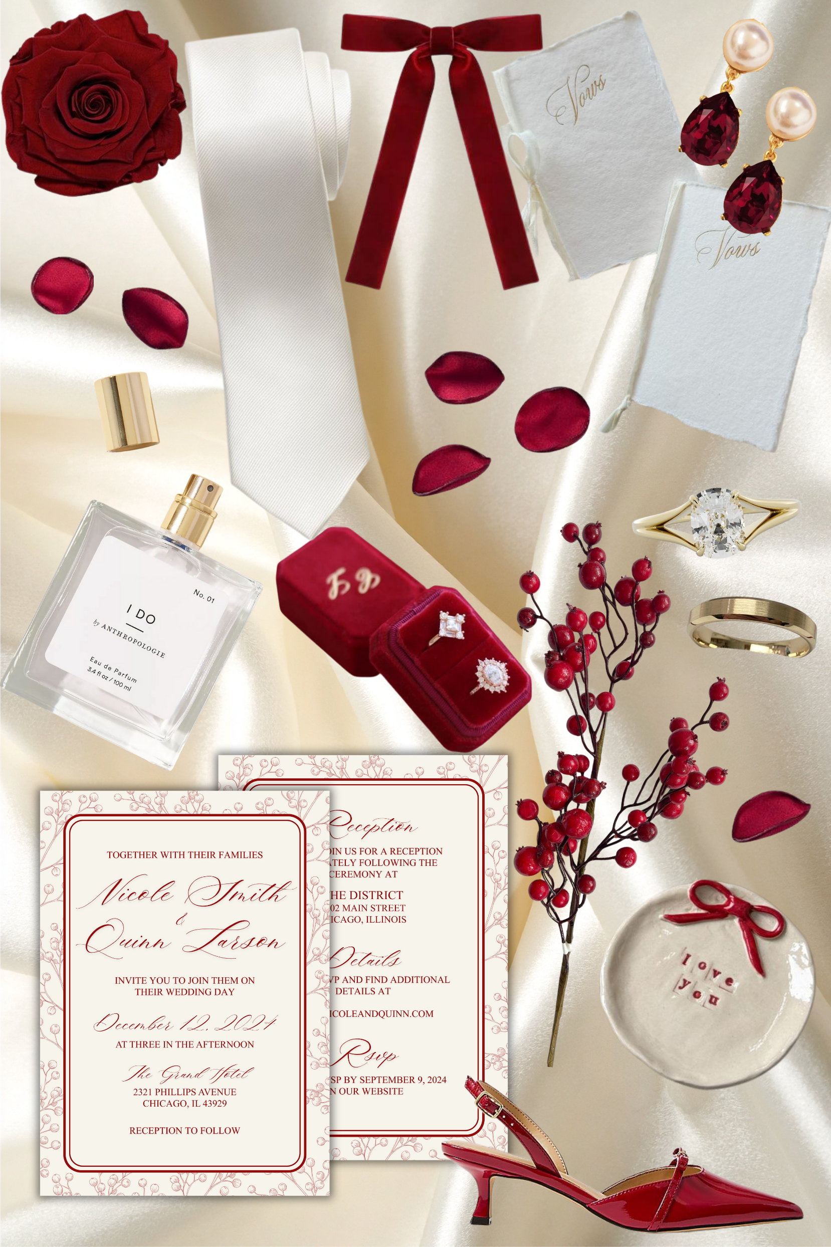 This flatlay demonstrates how a December wedding invitation suite can feel both romantic and elevated. Burgundy and cream invitations are especially popular for winter weddings because they photograph beautifully and complement seasonal décor.