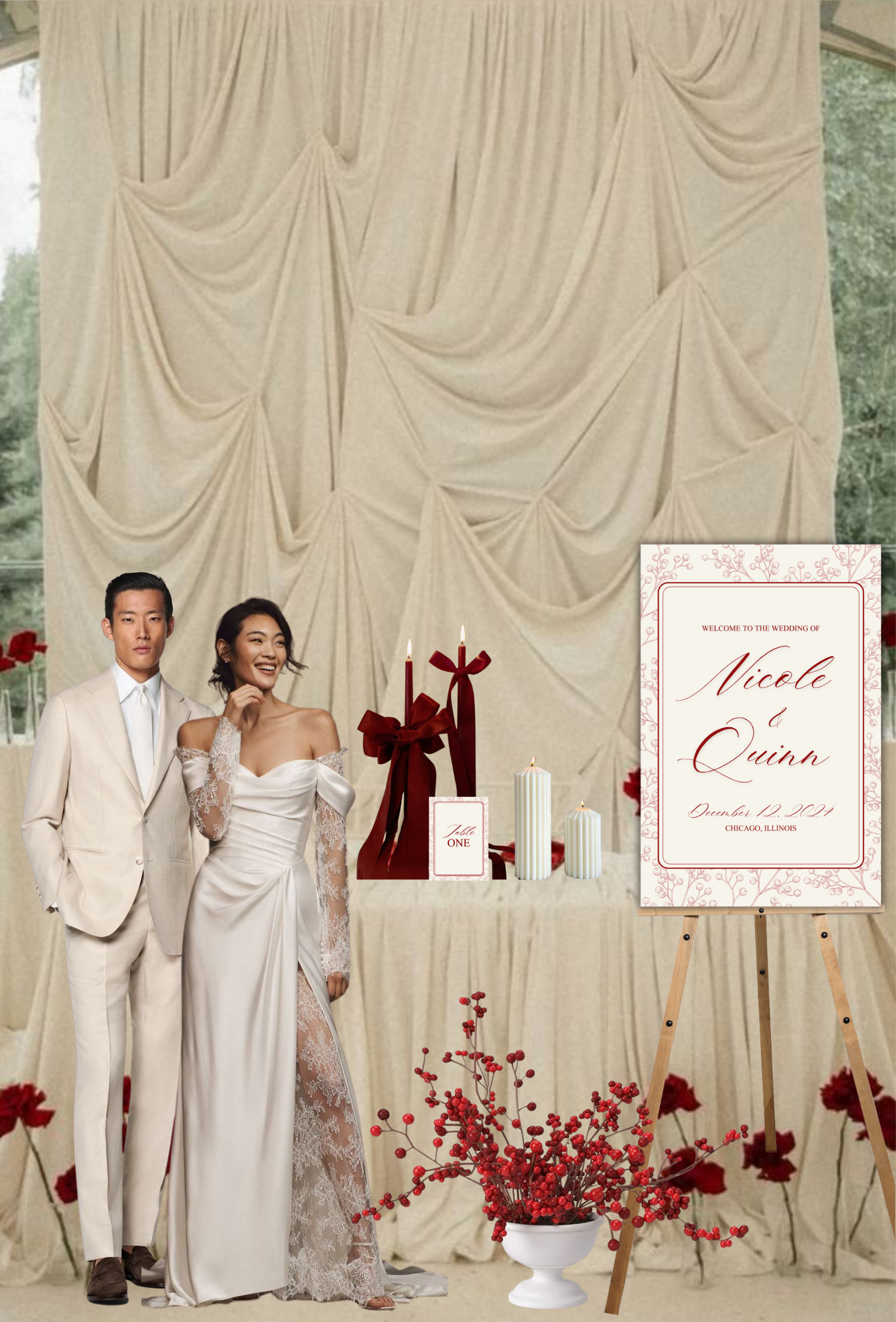 If you’re planning a December wedding and dreaming of something elegant, cozy, and seasonally inspired, this red berry winter wedding theme was designed with you in mind. Featuring rich burgundy tones, soft cream textures, and timeless holiday details, these collages bring together stationery, signage, and style inspiration into one cohesive winter wedding vision.