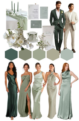 Is your favorite color green? If so, then this is the perfect wedding color scheme for you.Β This mood board incorporates all shades of green into the florals, table decor, bridesmaid dresses, stationery, and more! Check out the links to easily plan your wedding!